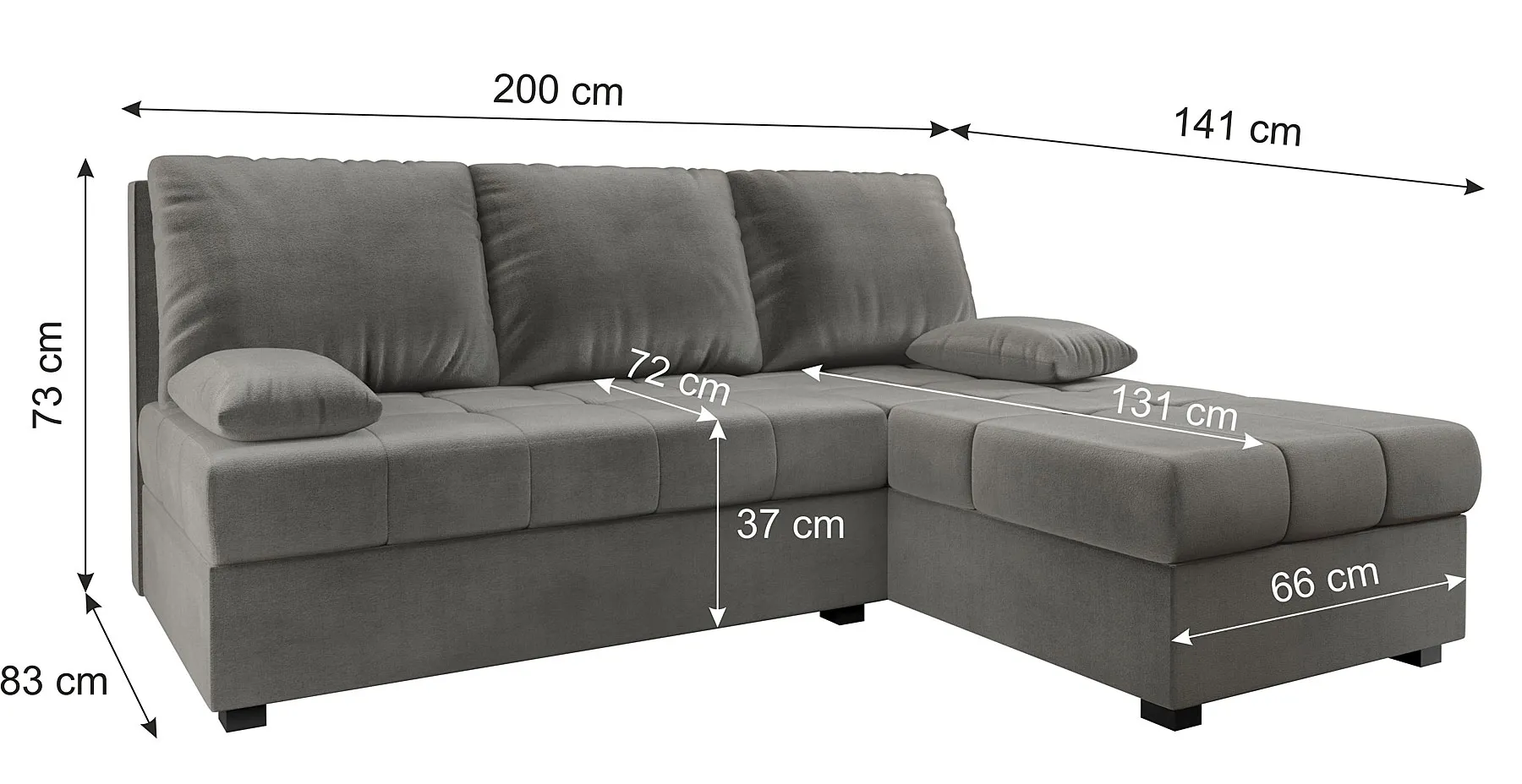 • Długość: 200 cm, szerokość: 141 cm, wysokość: 73 cm.
