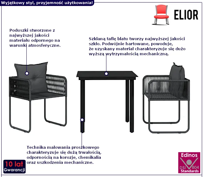 • Solidna konstrukcja i staranne wykonanie zapewniają, że zestaw ogrodowy będzie służył przez wiele sezonów zachowując nienaganny wygląd, nawet przy zmiennych warunkach atmosferycznych.