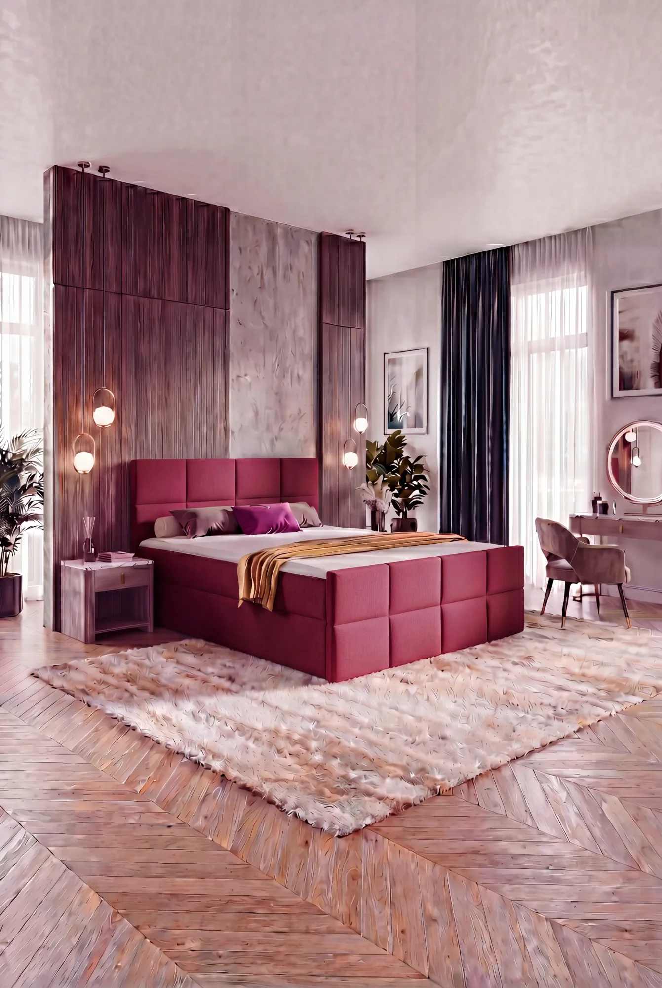 Aranżacja sypialni z czerwonym łóżkiem kontynentalnym Valmerio