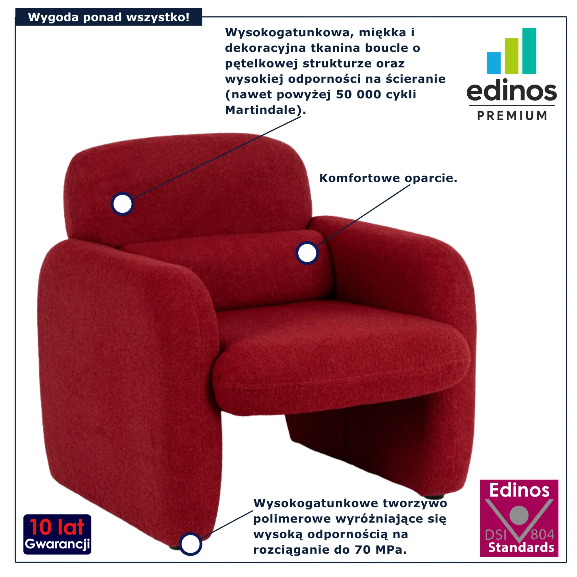 • Produkt posiada certyfikat jakości "Edinos Standards DSI 804", który potwierdza najwyższą jakość wykonania mebla oraz pełny stopień zgodności poszczególnych jednostek wytworzonego wyrobu z przyjętym wzorcem.
