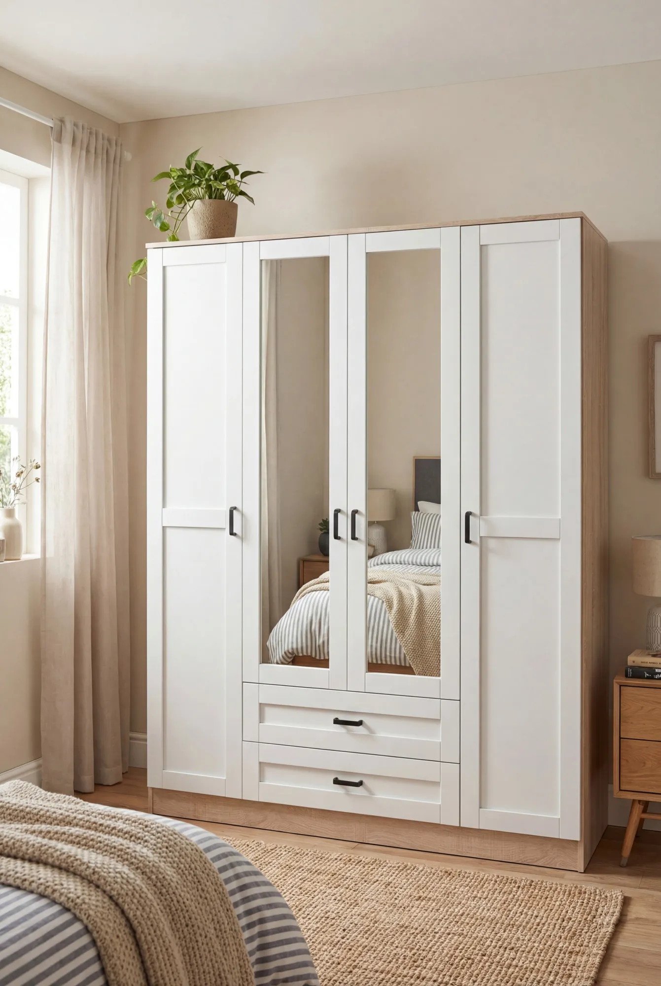 Są takie momenty, kiedy wiesz, że potrzebujesz czegoś więcej niż kolejnego mebla. Potrzebujesz porządku, przestrzeni i spokoju. Szafa Novera marki Edinos Premium powstała właśnie z tej potrzeby. To duża, czterodrzwiowa szafa, która daje realne poczucie kontroli nad codziennym chaosem - bez ścisku, bez kompromisów i bez ciągłego przekładania rzeczy z miejsca na miejsce. Za czterema drzwiami kryje się przestronne, logicznie zaplanowane wnętrze, w którym ubrania wiszące, składane i wszystkie dodatki mają swoje stałe miejsce. Dwie pojemne szuflady pozwalają wygodnie przechowywać bieliznę i drobiazgi, dzięki czemu poranki stają się prostsze i spokojniejsze. Duże lustra na frontach sprawiają, że wnętrze wygląda jaśniej i bardziej przestronnie, a Ty zyskujesz wygodne miejsce do codziennych przygotowań - bez biegania po całym domu. To szafa, która nie dominuje wnętrza, tylko je porządkuje. Daje poczucie harmonii i sprawia, że wszystko wreszcie jest dokładnie tam, gdzie powinno być.