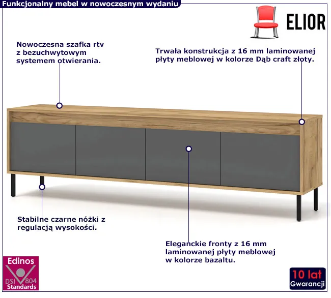 • Modny kolor: Dąb craft złoty + bazalt. W naszej posiadamy także inne szafki rtv na nóżkach. Stwórz własny praktyczny zestaw. Zamawiając produkty razem, oszczędzasz na współnej wysyłce.