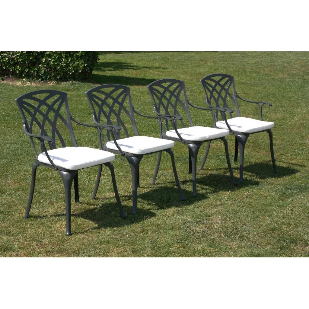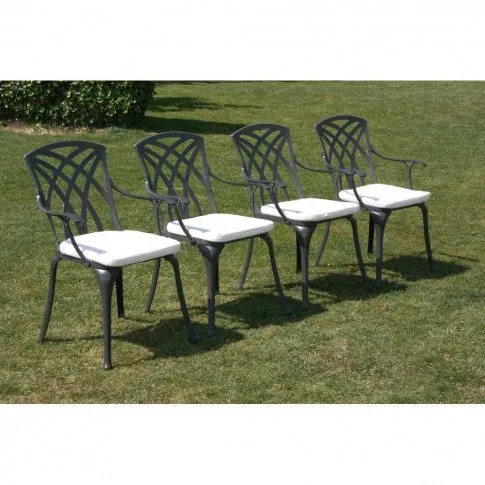 Zestaw 4 krzeseł ogrodowych wykonanych z aluminiowej ramy mających bardzo ładny wygląd. Krzesła ogrodowe są dostarczone z wygodnymi poduszkami. Krzesła można postawić na balkonie, tarasie, jako dodatkowe krzesło lub jako dopełnienie do zestawu ogrodzie. Krzesła ogrodowe wykonane są z materiałów odpornychna warunki pogodowe dzięki czemu można cieszyć się nimi przez wiele lat.