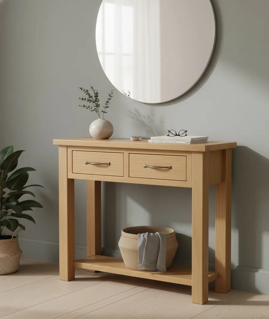 Dopasowałam tą konsolę w charakterze toaletki do mojej folkowej sypialni. Pasuje w komplecie z dębową szafą i łóżkiem. jest dość pakowna i do tego zajmuje na prawdę mało miejsca. Fajna dodatkowa półeczka. Polecam.