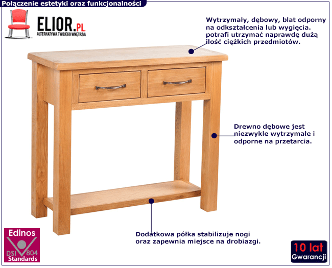 Styl rustykalny potrafi nadać niesamowitego charakter do każdego wnętrza. Prosty wystrój nawiązujący do wiejskich klimatów idealnie sprawdzi się nie tylko do poza miejskimi budynkami, ale będzie idealnie pozować jako motyw przewodni mieszkania w centrum dużego miasta. Przytulny wiejski kącik wewnątrz zgiełku miejskiego życia jest idealną odskocznią dla każdego. Wypoczynek w takim miejscu jest niebywałym przeżyciem. To tak jakby nagle wejść do innego świata. Konsola Ebis idealnie oddaje ten klimat. Z nią wszędzie poczujesz się bliżej natury. Wykonana z naturalnego drewna dębowego sprawia niezwykłe wrażenie. Nie bez powodu dąb nazywany jest królewskim drzewem. Jego szeroki blat zapewnia odpowiednią ilość miejsca na wszystkie potrzebne przedmioty. Dwie funkcjonalne szuflady zapewniają odpowiednią ilość miejsca do przechowywania wszelkiego rodzaju drobiazgów oraz potrzebnych przedmiotów. Specjalna dolna półka pozwala na umieszczenie dodatków oraz dekoracji, które jeszcze bardziej oddadzą klimat rustykalnego miejsca. Prosta budowa konsoli jest niezwykle dobrze przemyślaną ideą. Podkreśla prostotę natury oraz nie odwraca uwagi od szlachetnej faktury drewna dębowego. To właśnie dąb gra pierwszą rolę w stoliku Ebis.