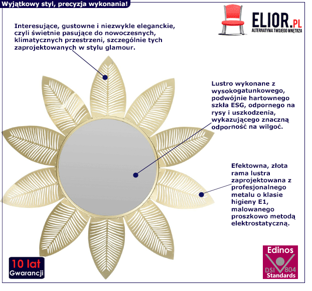 Nasza najnowsza propozycja dekoracyjna Vilen została zaprojektowana starannie i szlachetnie – tak, by mogła służyć swoją piękną prezencja i wygodą użytkowania na lata. Główną zasługą doskonałego wykonania złotego lustra Vilen jest dobór odpowiednich surowców. To widać już na pierwszy rzut oka, że Vilen zaprojektowano naprawdę profesjonalnie! Glamour lustro Vilen powstało z wysokogatunkowego, podwójnie hartownego szkła , odpornego na rysy i uszkodzenia. Ponadto szkło wykazujące znaczną odporność na wilgoć i nawet po długim użytkowaniu nie traci swoich właściwości. Ozdobna, oryginalna rama imitująca liście została wykonana z profesjonalnego metalu o klasie higieny E1, malowanego proszkowo metodą elektrostatyczną Zestawienie tych świetnych surowców sprawia, że lustro Vilen prezentuje się efektownie, a zarazem harmonijnie i subtelnie. Ponadto charakteryzuje się trwałością, odpornością na rysy oraz łatwością w czyszczeniu. Przepiękne lustro okrągłe Vilen nie tylko stanowi doskonałą dekorację wnętrza, lecz pełni również inne funkcje – sprawia, że pomieszczenie wydaje się większe i znacznie jaśniejsze. Nie wiesz, jak rozpogodzić ciemną, ciasną przestrzeń? Powieś w niej glamour lustro Vilen w złotej ramie imitującej słońce! Jego czysta linia oraz wyrafinowana klasa sprawiają, że przestrzeń staje się słoneczna, optymistyczna, pogodna i wyrazista. Design pełen przejrzystości, estetycznej klarowności i nieprzeciętnej harmonii? To wszystko zapewni Ci nasze szykowne lustro Vilen! Dobrze dobrane, szlachetne lustro pomoże Ci wydobyć ze swojego wnętrza indywidualny, wyjątkowy styl. Rozjaśni je, nada mu nowoczesnej klasy i designerskiego szyku. Pozwól sobie na aranżacyjną kreatywność i wnętrzarski funkcjonalizm z wysmakowanym, misternie wykonanym lustrem Vilen!