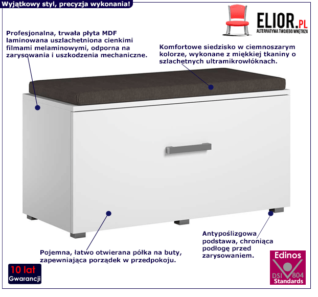 - Modna kolorystyka: biały, ciemnoszary. Kliknij w link i sprawdź także inne szafki na buty z siedziskiem w sklepie Edinos.pl. Stwórz swój praktyczny zestaw mebli.