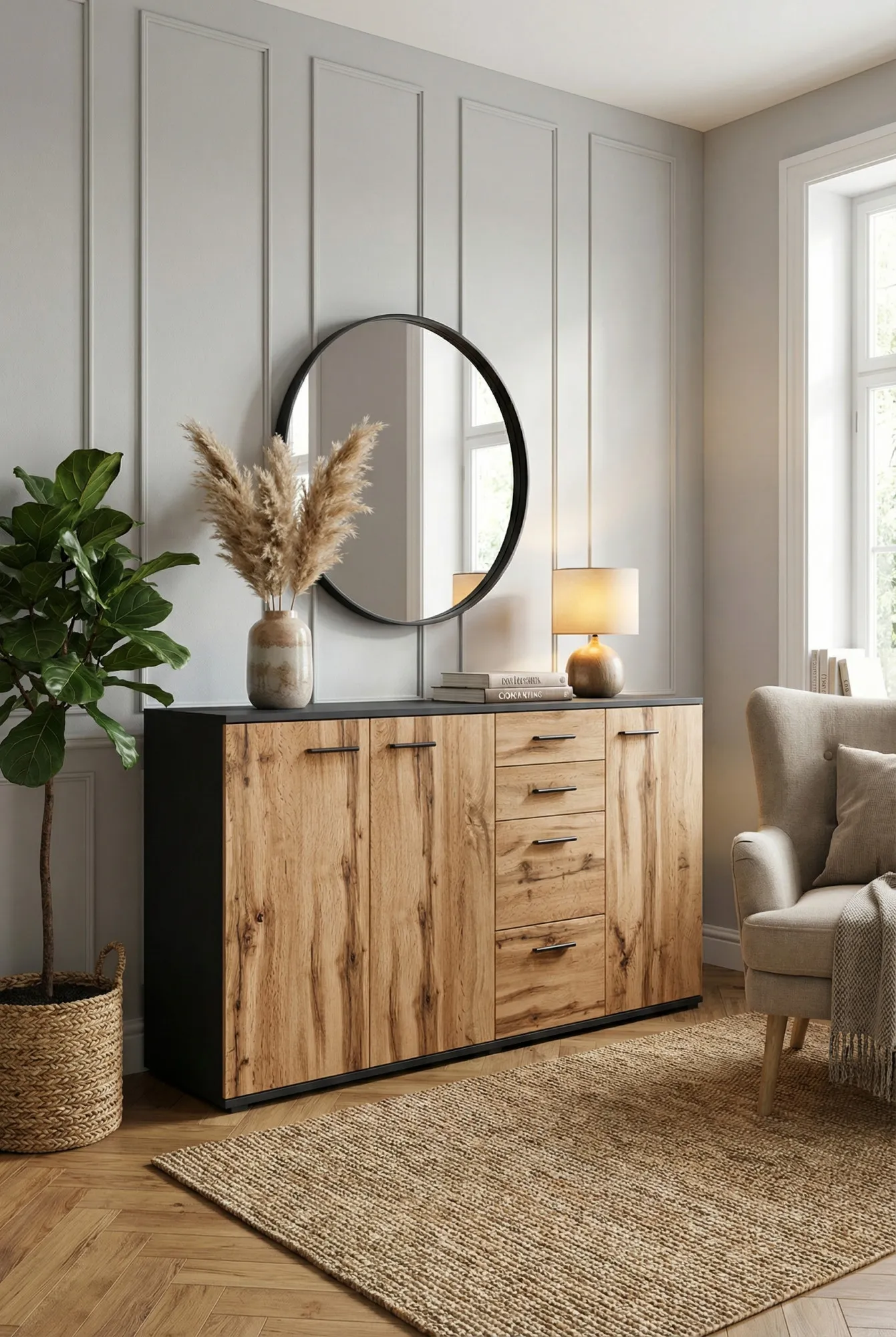 Aranżacja z wykorzystaniem komody z półkami i szufladami Asendri 5X grafit + dąb wotan