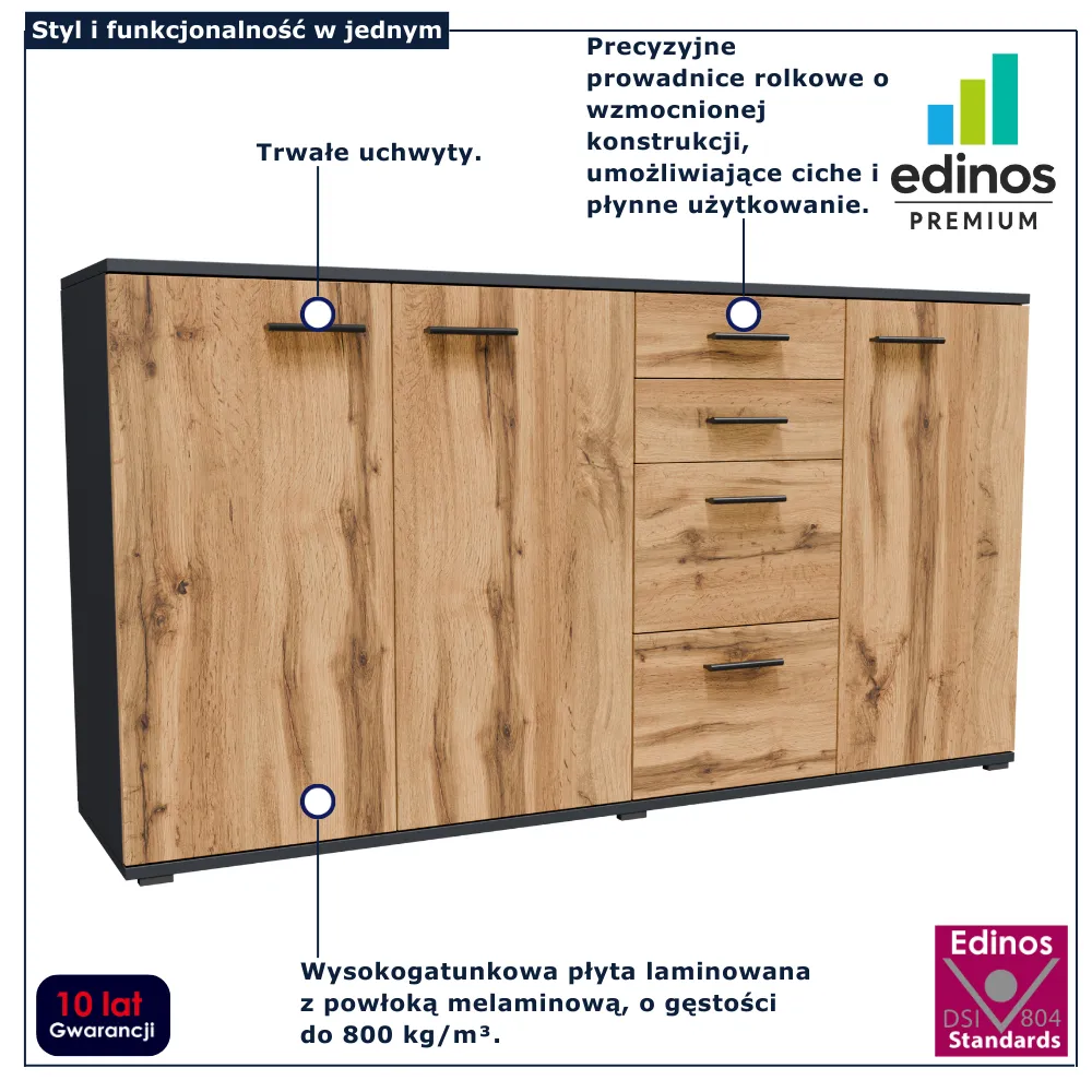 Komoda Asendri 5X marki Edinos Premium to model zaprojektowany z myślą o maksymalnej funkcjonalności i wygodnym przechowywaniu większej ilości rzeczy. Jej szeroka, stabilna bryła łączy pojemne szafki z praktycznym zestawem szuflad, tworząc idealne miejsce do organizacji odzieży, dokumentów, tekstyliów czy domowych akcesoriów. Dzięki przemyślanemu układowi wnętrza łatwo zapanujesz nad porządkiem, a wszystko będzie miało swoje miejsce. To komoda, która świetnie sprawdzi się w salonie, sypialni lub jadalni, wprowadzając do wnętrza poczucie harmonii i uporządkowania.