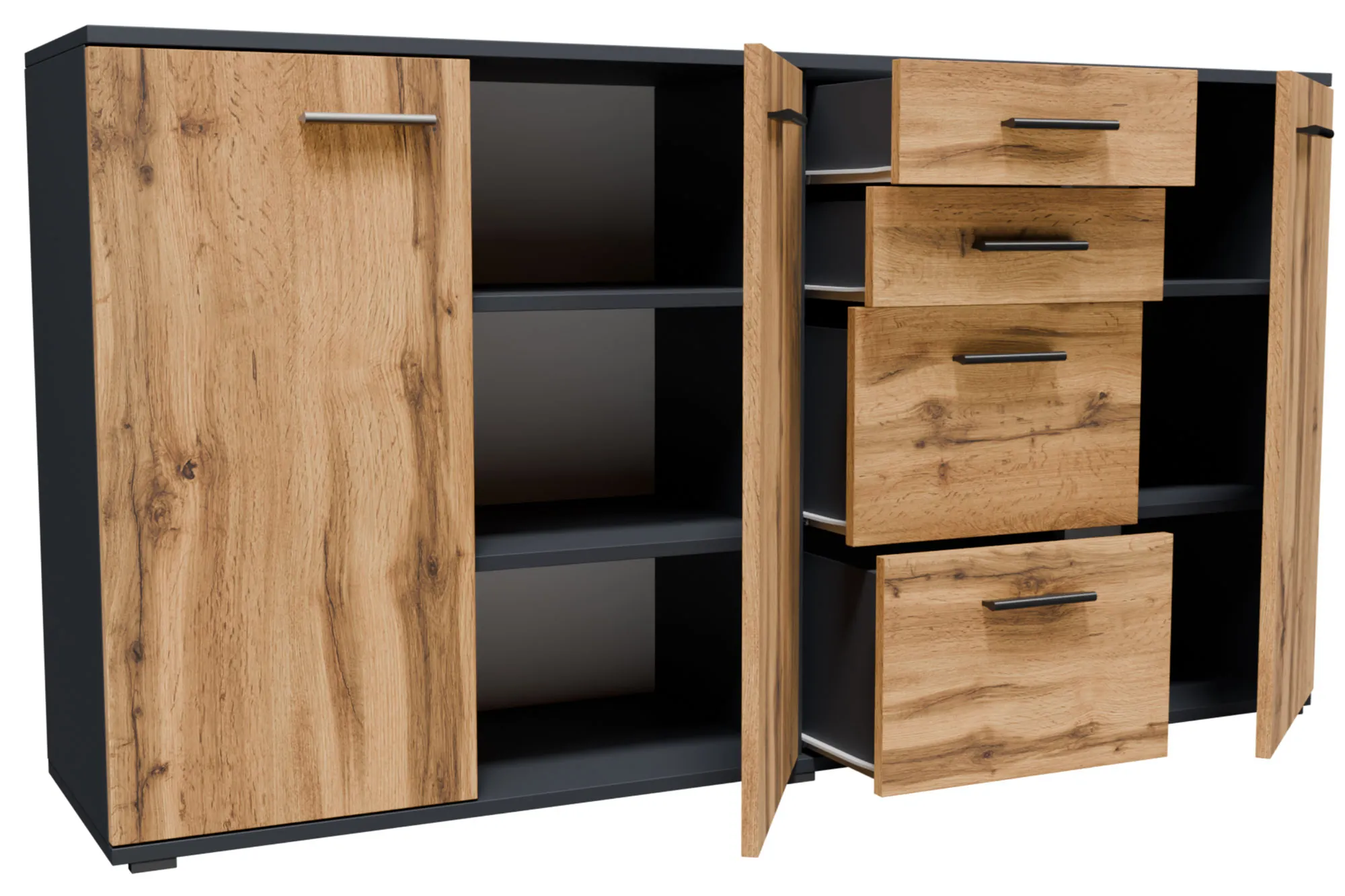 Długa komoda z szufladami i półkami grafit + dąb wotan - Asendri 5X