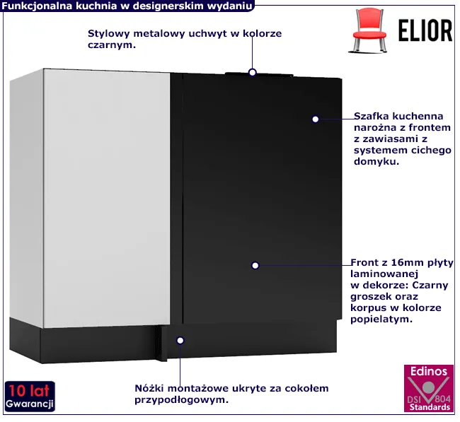 Szafka narożna okazała się świetnym rozwiązaniem w mojej kuchni. Pojemna, dobrze zaprojektowana, nie marnuje przestrzeni. Fronty są matowe, ale łatwe w czyszczeniu, nie widać na nich odcisków palców. Montaż był dobrze opisany i nie sprawił większych problemów. Całość stabilna i wygląda bardzo nowocześnie. Jeśli ktoś urządza kuchnię w stylu nowoczesnym lub loftowym, to ten model będzie pasował idealnie. Szybka dostawa, wszystko kompletne i bez uszkodzeń.