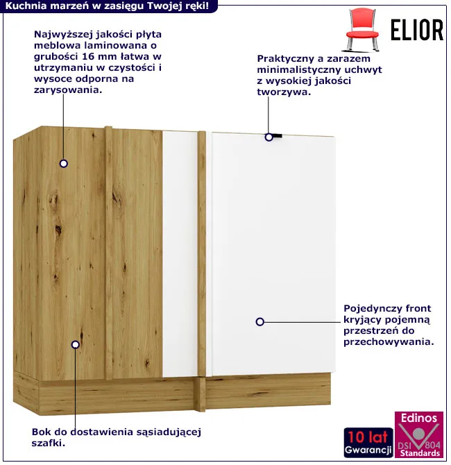 Szafka stojąca narożna Elandro 14X marki Edinos Premium to szafka kuchenna, która wprowadza powiew świeżości i elegancji do nowoczesnego wnętrza. Wyobraź sobie kuchnię, w której każdy element jest starannie zaplanowany, a przestrzeń zachwyca prostotą i funkcjonalnością. Szafka kuchenna z pojedynczym frontem Elandro 14X subtelnie łączy w sobie minimalistyczny design z nienaganną estetyką, tworząc harmonię i porządek. Idealna dla osób ceniących styl i wygodę, które pragną otaczać się przedmiotami łatwymi w codziennym użytkowaniu. Sprawdź, jak szafka kuchenna narożna Elandro 14X może zmienić Twoją kuchnię w miejsce, gdzie gotowanie staje się prawdziwą przyjemnością.
