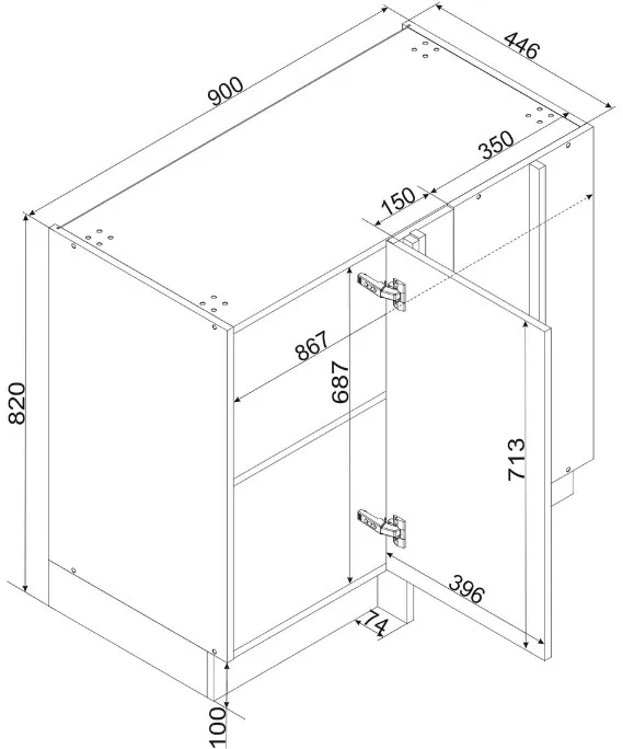 wysokość: 82 cm, szerokość: 90 cm, głębokość bez frontu/blatu: 44,6 cm.