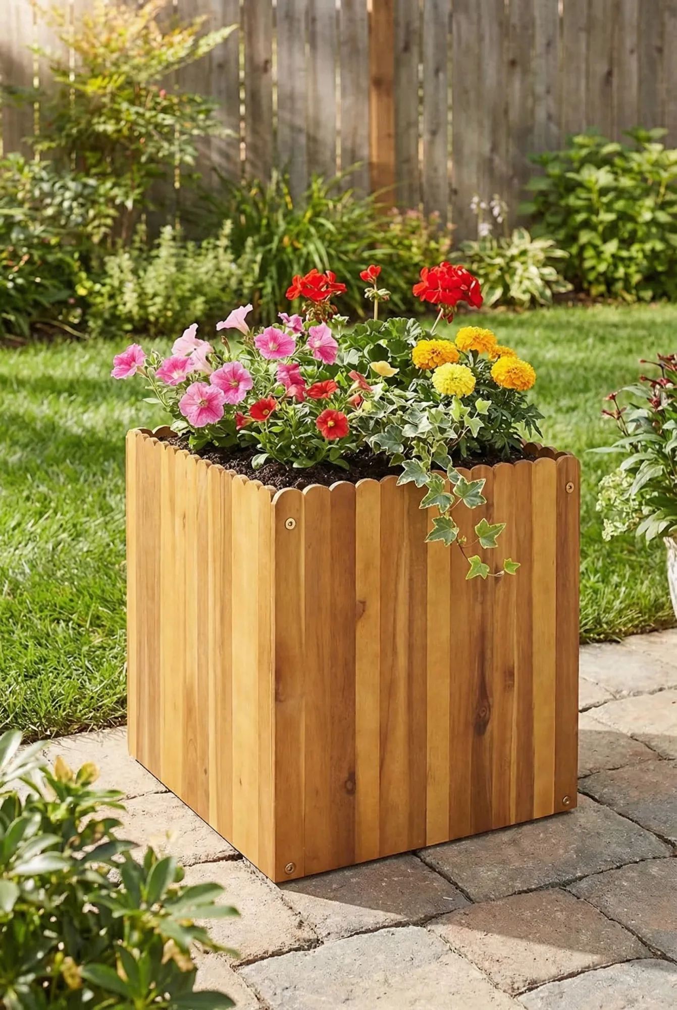 Aranżacja ogrodu z donicą z drewna akacjowego Teki 4X