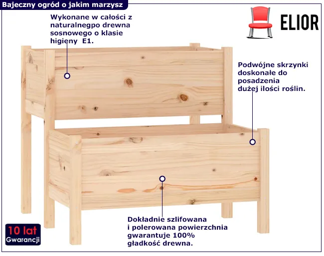 • Przestrzeń dla twórczości: Dwie pojemne skrzynki to zaproszenie dla Twojej kreatywności. Oferują miejsce dla kwiatów, ziół i warzyw, które stworzą wspaniałą kompozycję na Twoim trawniku czy tarasie.