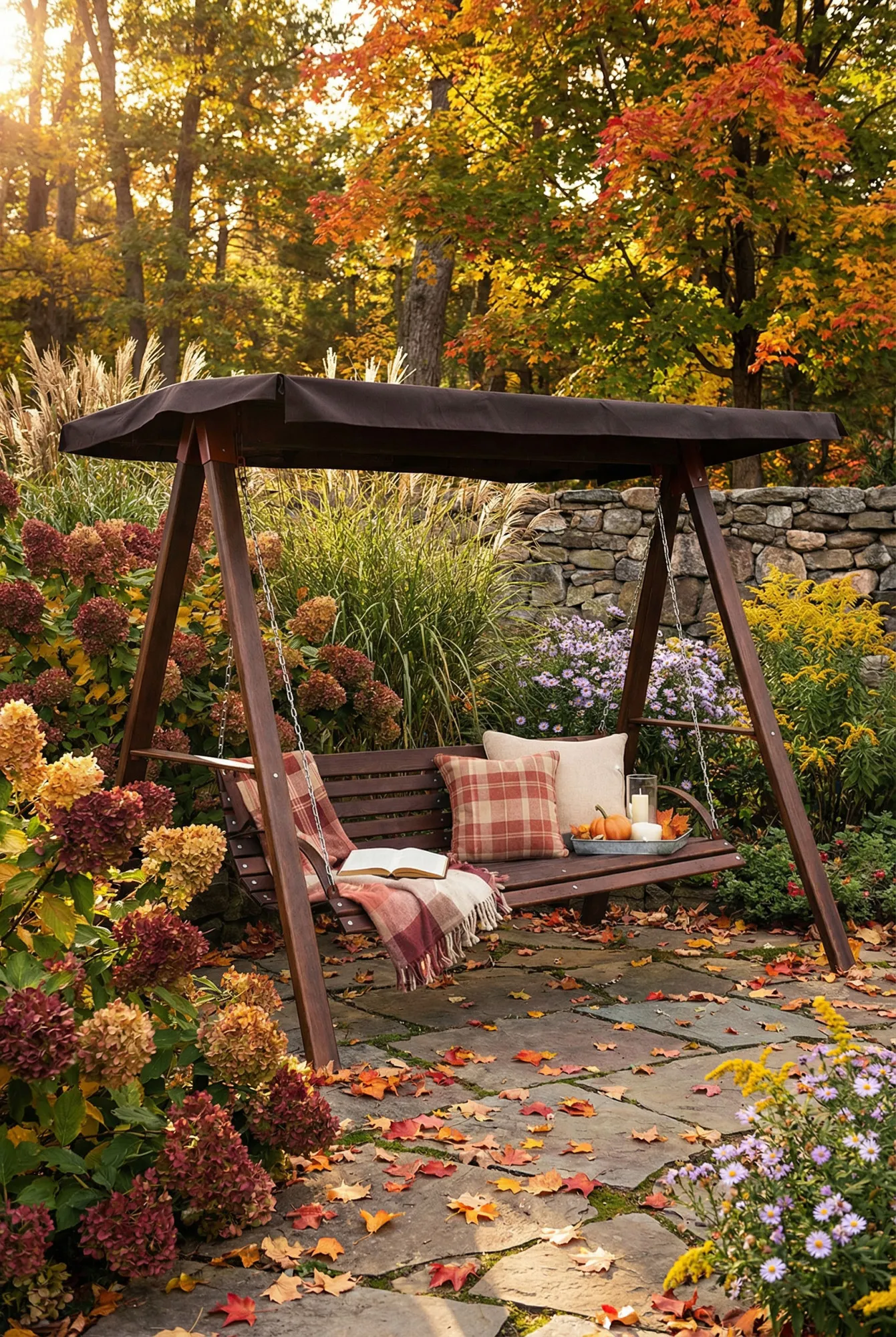 Poniżej prezentujemy aranżację ogrodu z wykorzystaniem drewnianej huśtawki z daszkiem Kaori 4X 180 cm: