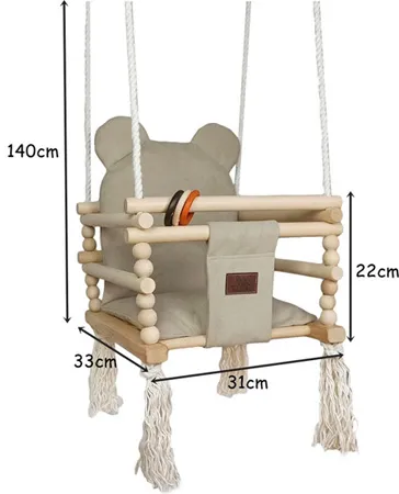 - Materiał: konstrukcja huśtawki została wykonana z wysokogatunkowego drewna bukowego, które cechuje się wysoką odpornością na zmienne warunki atmosferyczne. Liny to grube sploty z najwyższej jakości bawełny. Materiał siedziska to wysokogatunkowa welwetowa tkanina River 3XT marki Edinos Premium z antyalergicznym wypełnieniem.