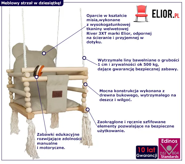 Marka Edinos Premium troszczy się o jakość swoich produktów, dlatego nasze huśtawki to prawdziwe meblowe perełki zrobione z najwyższej klasy surowców. Huśtawka Milos to ekologiczny produkt, wykonany z wysokogatunkowego drewna bukowego - twardego, wytrzymałego i odpornego na zmienne warunki atmosferyczne. Drewniane elementy konstrukcji dokładnie wypolerowaliśmy, dzięki czemu dajemy Ci pewność, że delikatna skóra malucha nie będzie narażona na żadne otarcia czy uszkodzenia. Huśtawka Milos zawieszona jest na grubych bawełnianych linach, które zapewnią nie tylko szaloną, ale przede wszystkim bezpieczną zabawę Twojemu dziecku. Liny zakończone zostały stalowymi cynkowanymi oczkami, które umożliwią montaż huśtawki. Poduszki w kształcie misia zostały obszyte wysokiej klasy, przyjemnym w dotyku materiałem welwetowym River 3XT marki Edinos Premium z antyalergicznym wypełnieniem. Tkanina jest lekka, odporna na uszkodzenia i nieziemsko delikatna.