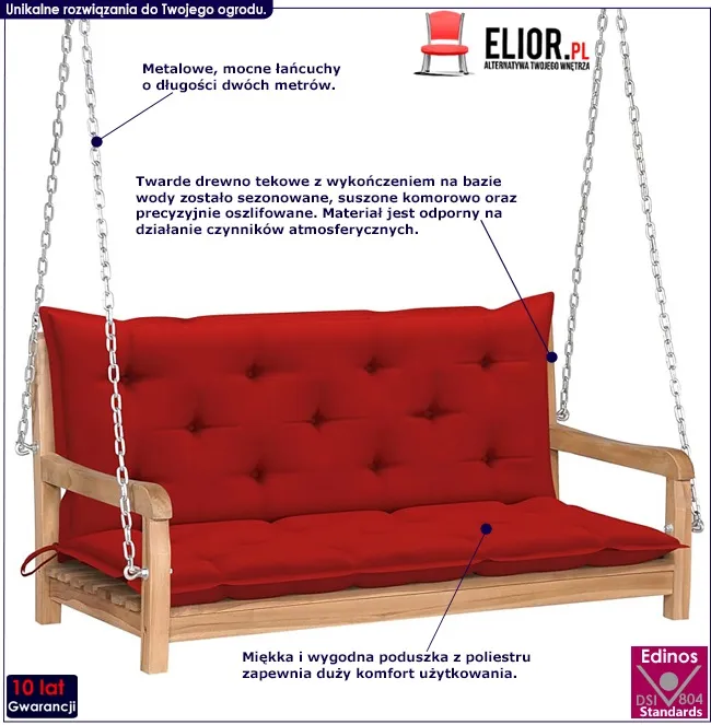 - Wymiary: szerokość – 120 cm, głębokość – 60 cm, wysokość – 57,5 cm - Głębokość siedziska: 50 cm - Wysokość oparcia: 42 cm - Długość łańcucha: 2,07 m - Wymiary poduszki na siedzisko i oparcie: długość – 120 cm, szerokość – 50 cm, grubość – 7 cm - Materiał: odporne na wpływ czynników atmosferycznych drewno tekowe, poliestrowa, miękka tkanina, metalowe i mocne łańcuchy. - Kolor: brązowy i czerwony. Kliknij w link sprawdź także inne huśtawki ogrodowe w sklepie Edinos.pl. Stwórz swój praktyczny zestaw mebli. - Produkt posiada certyfikat jakości "Edinos Standards DSI 804", który potwierdza najwyższą jakość wykonania mebla oraz pełny stopień zgodności poszczególnych jednostek wytworzonego wyrobu z przyjętym wzorcem. - Bardzo łatwy montaż (w zestawie znajduje się czytelna i dokładna instrukcja montażu mebla). - Gwarancja 10 lat (inni producenci oferują maksymalnie 24 miesiące gwarancji. Tylko u nas otrzymujesz pełną jakość potwierdzoną aż 10-letnią gwarancją)!