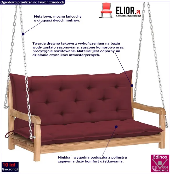 - Długość łańcucha: 2,07 m - Wymiary poduszki na siedzisko i oparcie: długość – 120 cm, szerokość – 50 cm, grubość – 7 cm - Materiał: odporne na wpływ czynników atmosferycznych drewno tekowe, poliestrowa, miękka tkanina, metalowe i mocne łańcuchy. - Kolor: brązowy i karminowy. Kliknij w link sprawdź także inne huśtawki ogrodowe w sklepie Edinos.pl. Stwórz swój praktyczny zestaw mebli. - Produkt posiada certyfikat jakości "Edinos Standards DSI 804", który potwierdza najwyższą jakość wykonania mebla oraz pełny stopień zgodności poszczególnych jednostek wytworzonego wyrobu z przyjętym wzorcem. - Bardzo łatwy montaż (w zestawie znajduje się czytelna i dokładna instrukcja montażu mebla). - Gwarancja 10 lat (inni producenci oferują maksymalnie 24 miesiące gwarancji. Tylko u nas otrzymujesz pełną jakość potwierdzoną aż 10-letnią gwarancją)!