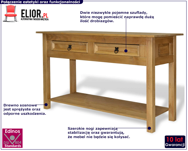 Konsola Hilda wykonana została z naturalnego drewna sosnowego. Drewno sosnowe jest sprężyste, a jednocześnie odporne na różnego rodzaju uszkodzenia mechaniczne. Ponadto sosna ma dobroczynny wpływ na ludzkie zdrowie. Dodatkowo ma właściwości elektrostatyczne, a więc nie tylko nie przyciąga kurzu, ale zapobiega również jego kłębieniu się w powietrzu. Meble sosnowe są ekologiczne, dlatego szczególnie polecane są alergikom i małym dzieciom. Jednocześnie ważna jest higroskopijność czyli zdolność do pochłaniania oraz oddawania wilgoci do otoczenia. Pozwala to utrzymać mebel zawsze w doskonałym stanie bez względu na warunki panujące we wnętrzu. Dokładne szlifowanie pozwoliło uwolnić niezwykłą strukturę drewna. Pozwala to cieszyć się niezwykle szykownym produktem. Nie ma na świecie dwóch identycznych kawałków drewna, dlatego każda konsola Hilda jest unikatowa. Jest to możliwe tylko dzięki zastosowaniu naturalnego drewna wysokiej klasy.