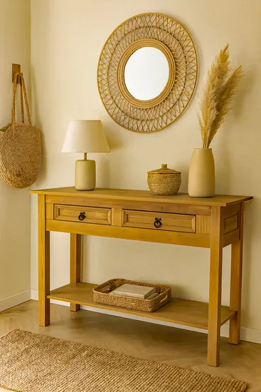 Produkt Drewniana konsola boho z szufladami i półką - Hilda