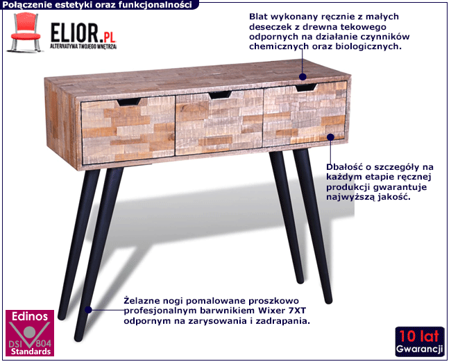 Konsola Legit została złożona przy użyciu małych deseczek z drewna tekowego. Ten rodzaj charakteryzuje się wysoką, naturalną zawartością substancji oleistych i kwasu krzemowego, dzięki czemu nie nasiąka wodą i jest odporne na działanie czynników chemicznych oraz biologicznych. Podczas suszenia prawie nie zmienia objętości i nie kurczy się, co powoduje, że chętnie jest stosowane w przemyśle meblarskim. Świeże drewno ma jasnożółtą barwę i intensywny, przyjemny zapach, później brązowieje. Ręczna produkcja gwarantuje niezapomniany styl i dbałość o każdy detal tego niezwykłego mebla. Nogi zostały wykonane z wysokiej klasy żelaza pomalowanego proszkowo odpornym na zarysowania i zadrapania. Technika malowania proszkowego charakteryzuje się dużą trwałością, odpornością na korozję, chemikalia, wysoką temperaturę oraz uszkodzenia mechaniczne, dzięki czemu znacznie podnosi walory użytkowe i estetyczne mebla.