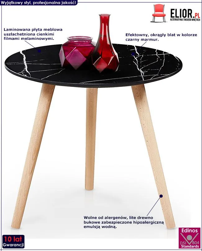 Komfortowa w użytkowaniu i atrakcyjna wizualnie okrągła ława Edis wyróżnia się nie tylko swoją niebanalną formą i praktycznym kształtem, ale także zastosowaniem materiałów najwyższej jakości. To dlatego cieszy się ona powodzeniem wśród osób wybierających niebanalne rozwiązania i szybko zyskała miano bestsellera. Lekka i delikatna konstrukcja ławy wykonana została z naturalnego drewna bukowego wolnego od alergenów, a następnie zabezpieczonego hipoalergiczną emulsją wodną. Lite drewno wyróżnia się niezwykłą wytrzymałością i odpornością na uszkodzenia mechaniczne, co gwarantuje Ci długie i komfortowe użytkowanie. Efektowny, okrągły blat ławy w kolorze czarny marmur wyprodukowano z najwyższej jakości laminowanej płyty meblowej o klasie higieny E1, uszlachetnionej cienkimi filmami melaminowymi. Posiada także specjalne włókna ułożone różnokierunkowo o strukturze sinusoidalnej, co zapewnia nadanie jej cech jakościowych oraz wytrzymałościowych. Stonowana kolorystyka i prosta forma sprawiają, że stolik kawowy Edis doskonale sprawdza się we wnętrzach urządzonych zarówno w stylu minimalistycznym, jak też skandynawskim czy nowoczesnym. Ława Elior nadaje wnętrzu harmonii i modnego świeżego designu, a każdy łyk kawy przy niej wypity pozwala Ci odetchnąć od codziennego zgiełku i pośpiechu. Nadaj Twojemu wnętrzu wyrazistego designu w ekspresyjnym, nowatorskim stylu z funkcjonalną ławą Edis!