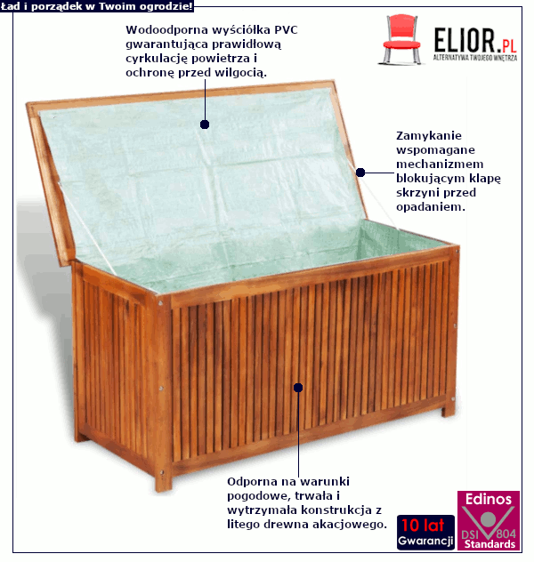 Użyte do produkcji skrzyni lite drewno akacjowe odznacza się niebywałą trwałością, ale i wytrzymałością na zmienne, nierzadko gwałtowne warunki atmosferyczne. Skrzynia ogrodowa Iwerna 2X marki Edinos Premium skutecznie oprze się także naciskowi i pęknięciom, a dzięki wodoodpornemu, wyścielającemu wnętrze materiałowi zapewni składowanym przedmiotom ochronę przed wilgocią i dobrą cyrkulację powietrza. Bez obaw możesz umieścić ją w wybranym miejscu w ogrodzie, tak by służyła Ci na wyciągnięcie ręki.