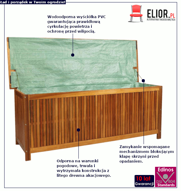 Użyte do produkcji skrzyni lite drewno akacjowe odznacza się niebywałą trwałością, ale i wytrzymałością na zmienne, nierzadko gwałtowne warunki atmosferyczne. Skrzynia ogrodowa Iwerna 3X marki Edinos Premium skutecznie oprze się także naciskowi i pęknięciom, a dzięki wodoodpornemu, wyścielającemu wnętrze materiałowi zapewni składowanym przedmiotom ochronę przed wilgocią i dobrą cyrkulację powietrza. Bez obaw możesz umieścić ją w wybranym miejscu w ogrodzie, tak by służyła Ci na wyciągnięcie ręki.
