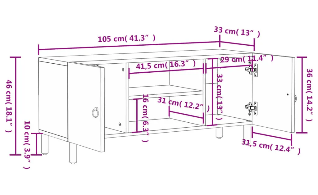 • Wymiary:  szerokość: 105 cm, wysokość: 46 cm, głębokość: 33 cm.