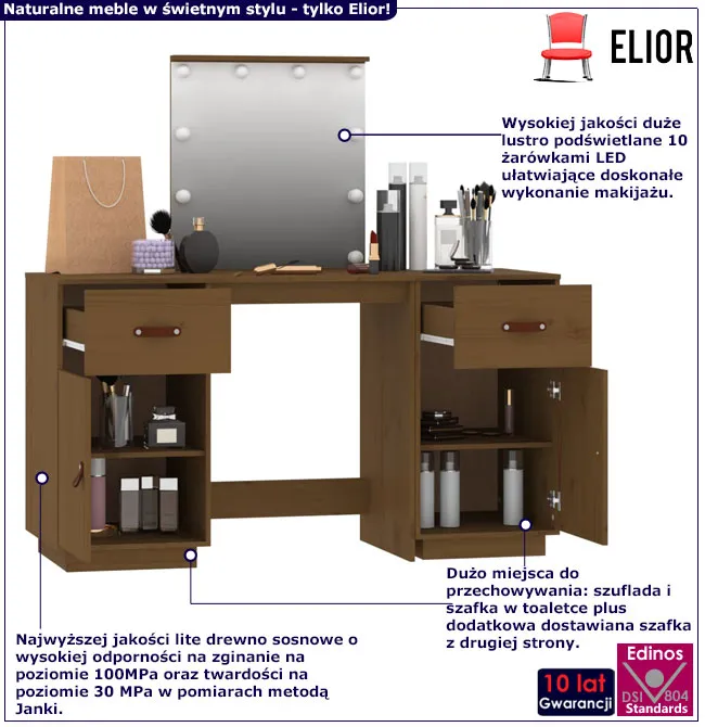 • Kolor: miodowy brąz. W naszej ofercie posiadamy także inne toaletki drewniane.