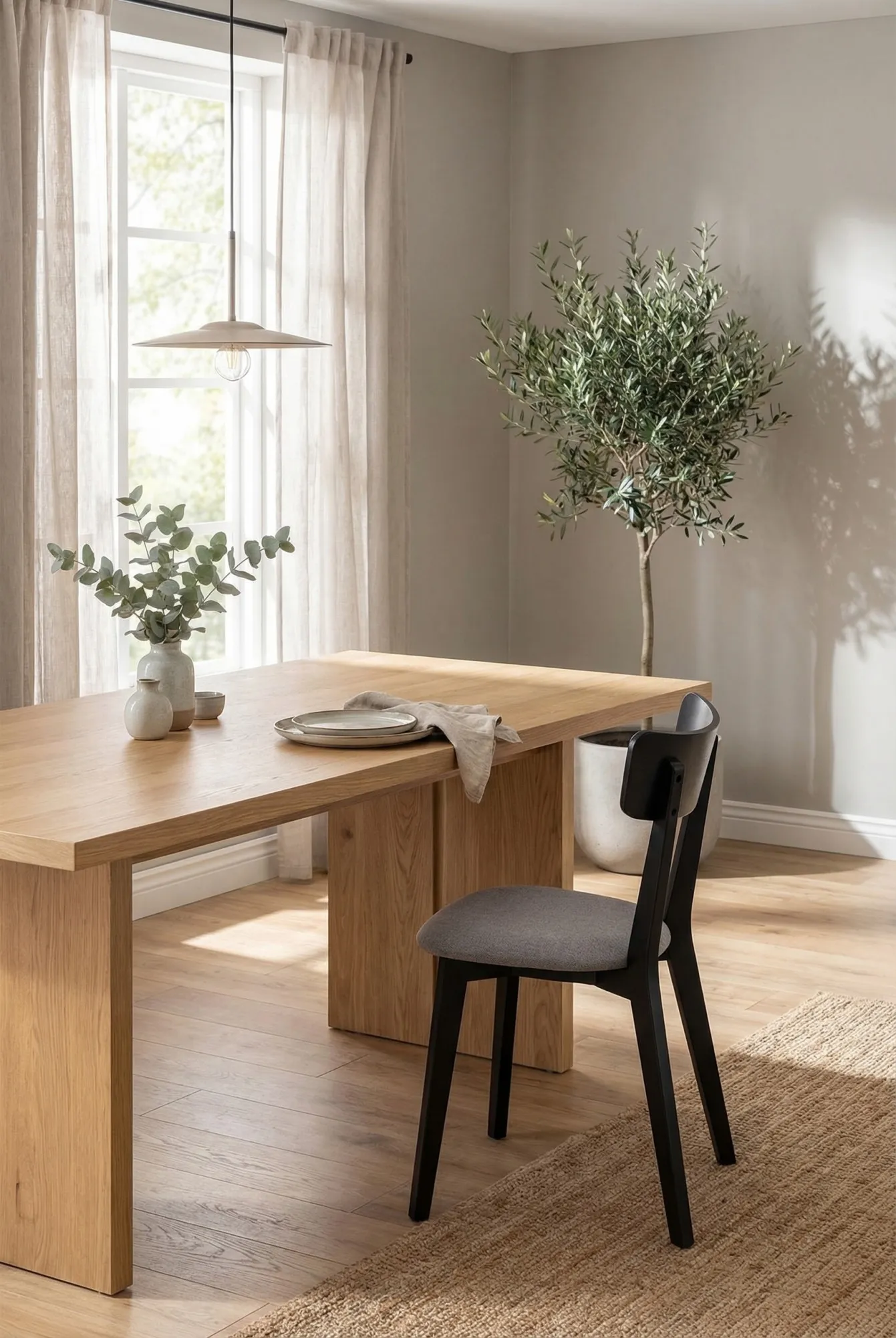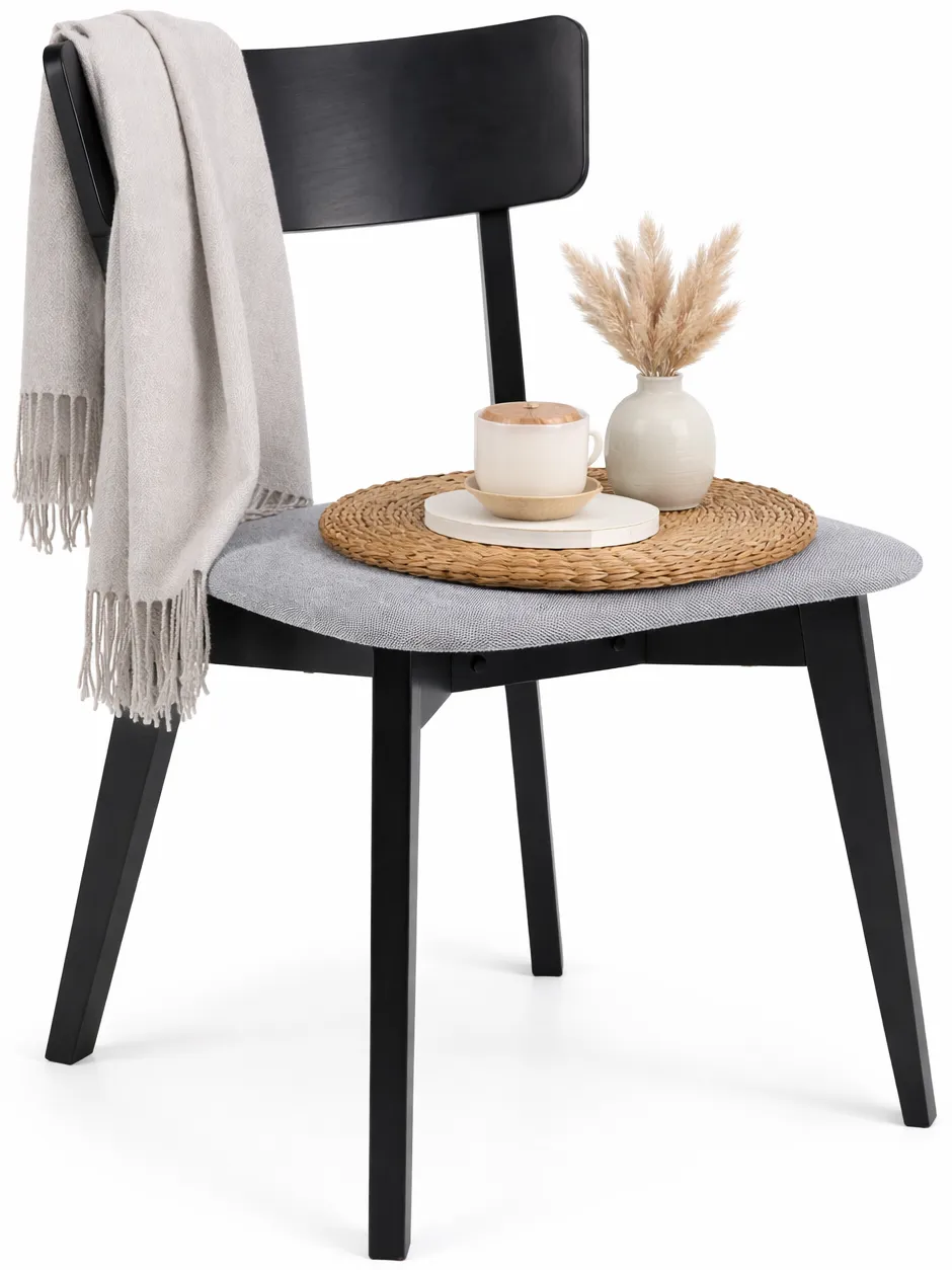 Bardzo dobrze wyprofilowane siedzisko, które sprawia, że można komfortowo spędzać czas przy stole. Czarny kolor drewna dodaje wnętrzu charakteru i nowoczesnego akcentu. Tapicerka łatwa do utrzymania w czystości, a całość wygląda zdecydowanie lepiej niż na zdjęciach.