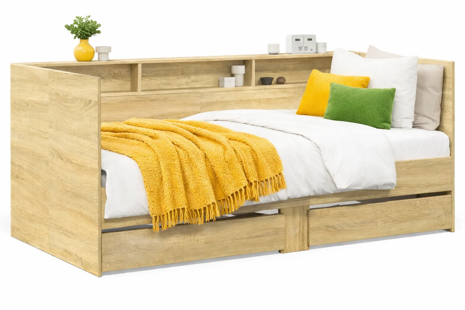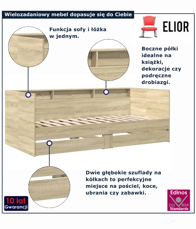Masz dość ciągłego przekładania rzeczy z kąta w kąt, braku miejsca na pościel czy wiecznie zagraconej sypialni? W takim razie łóżko z szufladami i regałem Santa marki Elior może być dokładnie tym, czego potrzebujesz. To sprytne rozwiązanie 2-w-1 łączy funkcjonalność sofy i łóżka, a przy tym oferuje miejsce do przechowywania, którego nigdy nie jest za dużo. Świetnie sprawdza się w mniejszych wnętrzach, gdzie każdy centymetr ma znaczenie – w dzień staje się wygodnym miejscem do siedzenia, a nocą oferuje komfortowy sen. A co najlepsze, porządek robi się niemal sam – wystarczy wsunąć rzeczy do pojemnych szuflad i gotowe.