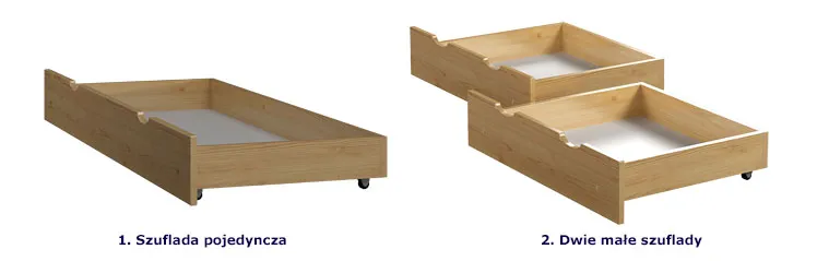 • Zestaw składa się z: łóżka o wymiarach 160x80 cm, stelaża, materaca piankowego oraz szuflady pojedynczej lub dwóch małych o głębokości 63cm (prosimy o informację o wyborze przy zakupie łóżka). Jeśli potrzebujesz wersji łóżka bez szuflady jest ono dostępne tutaj.