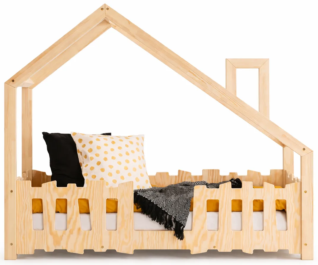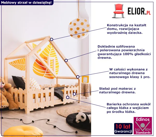 Cudowne łóżko Uzo to mebel w kształcie domku, który przeniesie Twojego maluszka w czarodziejski świat bajek. Wystarczy kilka drobiazgów, takich jak zwiewna, jasna firanka przewieszona z delikatnie świecącymi lampkami przez górną cześć łóżka i mamy wspaniałe łoże dla małej księżniczki. Zawieszając kilka pluszowych zwierzaków przy leśnej tapecie, Twój mały podróżnik poczuje zew dżungli. Barierka ochronna wokół całego łóżka w kształcie płotka zapewni bezpieczeństwo każdego maluszka, dodając uroku całości mebla. Drewniane łóżko w kształcie domu świetnie wpasuje się zarówno do pokoju chłopca, jak i dziewczynki bez konieczności wymiany wszystkich mebli! Łóżko Uzo marki Edinos Premium to radość z zabawy w ciągu dnia i bezpieczny sen w nocy!