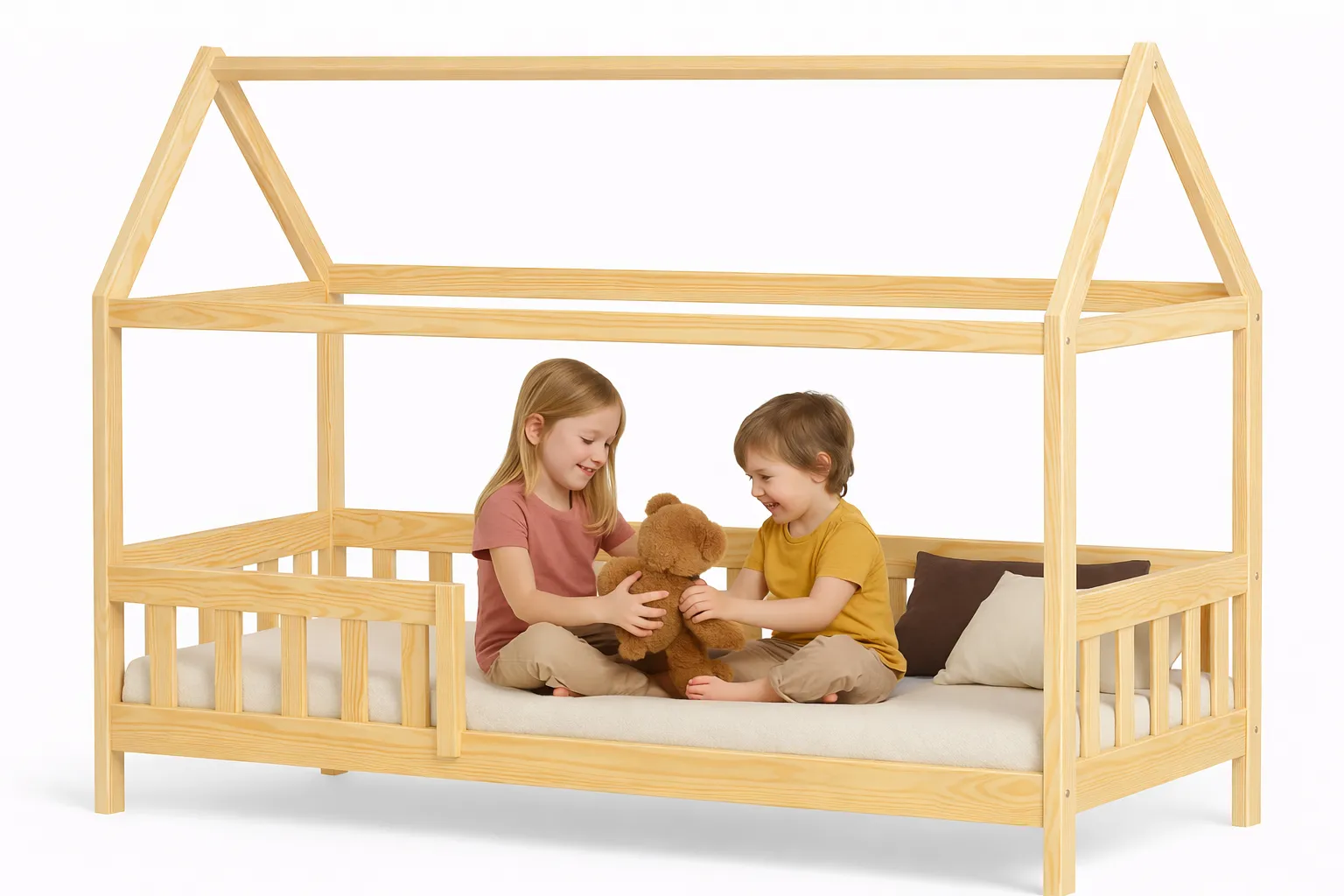 Magiczne dziecięce łóżko nadające się dla chłopczyka jak i dla dziewczynki, konstrukcja jest cudowna, stylizowana na kształt domka, a do tego dobrze wyszlifowana i gładka, bezpieczna dla dzieci. Zadbano również o barierkę zapobiegającej wypadnięcia pociechy, naturalne drewno jest idealne do pokoików dziecięcych ^^