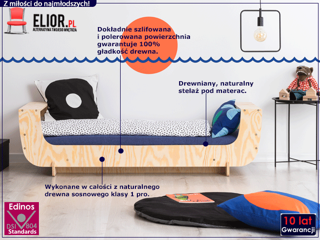 Według nas podstawowym aspektem w wyborze odpowiedniego łózka jest jego jakość. Jest to mebel na lata, zatem musi być solidny i trwały. Biorąc pod uwagę fakt, że w pokoju najmłodszych służy nie tylko do wypoczynku, ale także wielogodzinnych, szalonych zabaw - dobre wykonanie to podstawa. Specjaliści marki Elior zadbali o każdy najmniejszy szczegół, abyś na długo zapomniał o wymianie go na nowe. Drewniane łóżko Sturli 10X wykonane zostało w całości z naturalnego i prawdziwego drewna sosnowego. Dokładnie szlifowana powierzchnia materiału zabezpieczona została naturalnym impregnatem ochronnym, który chroni przed zarysowaniem oraz przetarciem drewna. Emulsje ochronne marki Elior produkowane na bazie wody są całkowicie wolne od formaldehydu , dzięki czemu charakteryzują się neutralnym zapachem. Nie zawierają substancji, które w trakcie użytkowania mebli mogą się ulatniać, ani innych szkodliwych związków chemicznych. Dzięki temu są dobrze tolerowane przez alergików oraz osoby wrażliwe i co najważniejsze - mają neutralny wpływ na zdrowie Twojego dziecka w przeciwieństwie do innych produktów konkurencji. Sturli 10X bezsprzecznie jest najlepszym co możesz podarować swojemu dziecku!