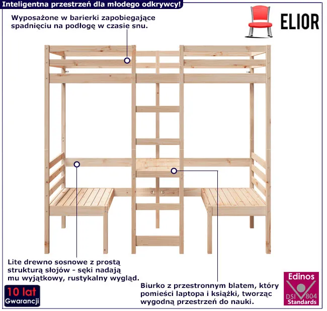 Łóżko piętrowe Kerbi 4X marki Edinos Premium to esencja skandynawskiego stylu, która przemienia przestrzeń w oazę funkcjonalności i elegancji. Zintegrowane biurko z dwoma krzesłami tworzy idealne miejsce do nauki i pracy, a solidna konstrukcja zapewnia bezpieczeństwo i komfort na co dzień. Wybierz Kerbi 4X i ciesz się idealnym połączeniem komfortu, stylu i praktyczności w swoim domu. Zamów teraz za jedyne 1668 zł!