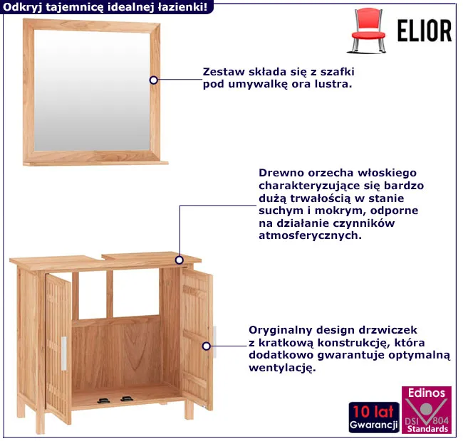 Zestaw od Eliora jest po prostu piękny. Drewno jest wysokiej jakości, co widać na pierwszy rzut oka. Meble wprowadzają do wnętrza harmonię i spokój. Codzienne korzystanie z nich to czysta przyjemność. Lustro dodatkowo ożywia przestrzeń.