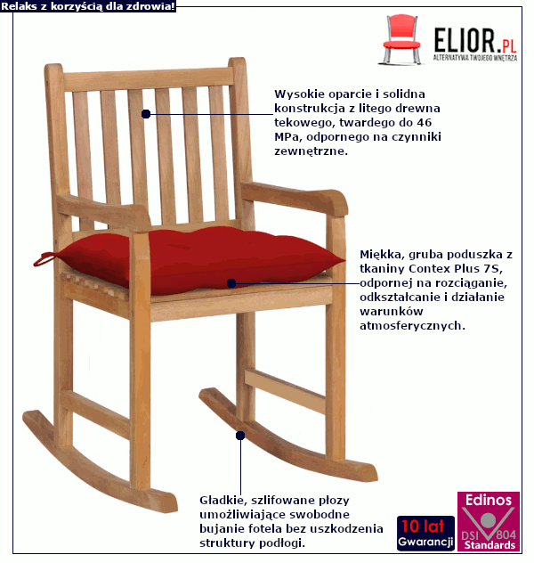 - Kolor fotela: Brązowy, kolor poduszki: czerwony. Szukasz innego fotela bujanego? Kliknij w link i sprawdź fotele bujane w sklepie Edinos.pl. Stwórz swój praktyczny zestaw mebli.