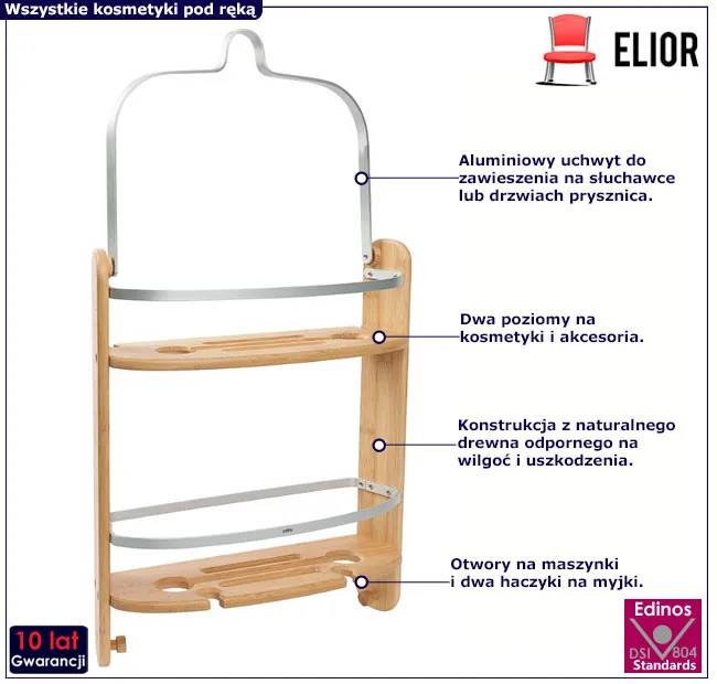 • organizer nie wymaga montażu, wystarczy go zawiesić na słuchawce prysznica lub na drzwiach do kabiny