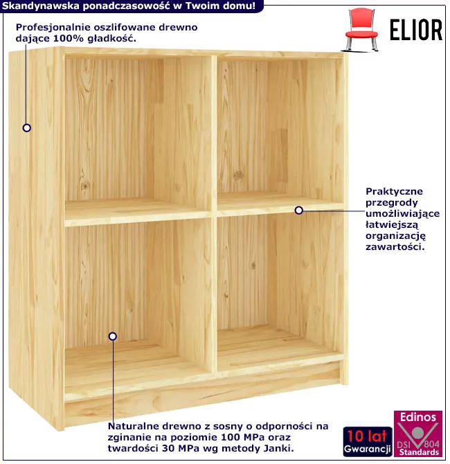 • Solidność litego drewna: materiał, z którego wykonany jest regał - lite drewno sosnowe - zapewnia nie tylko jego stabilność, ale także długoletnią trwałość i wytrzymałość na codzienne użytkowanie.
