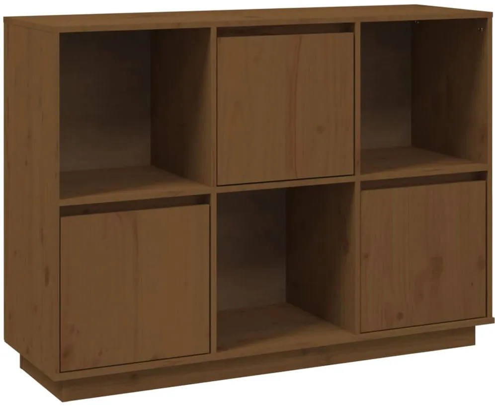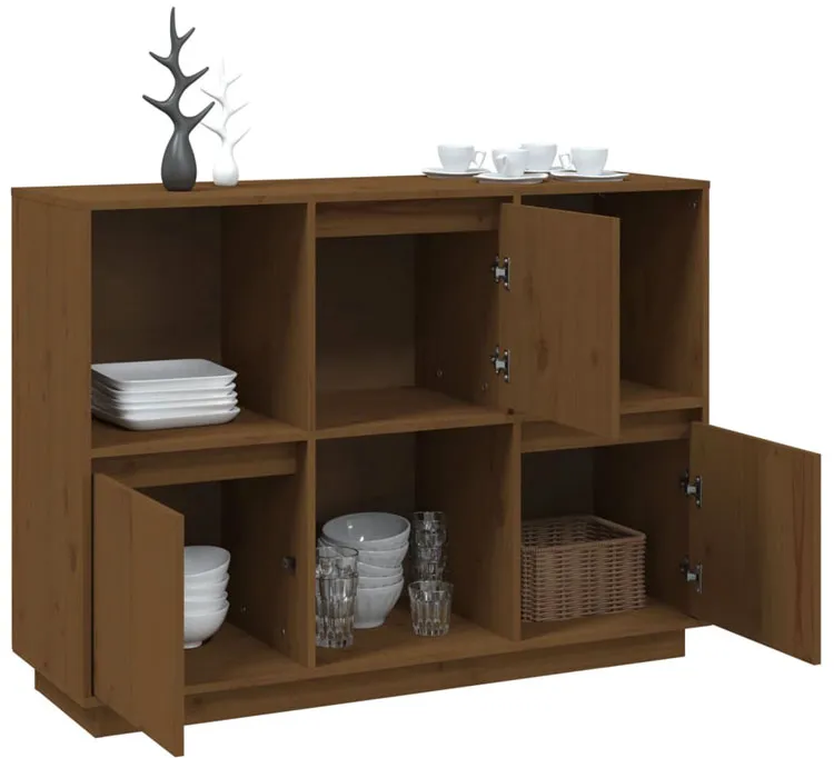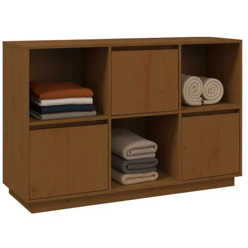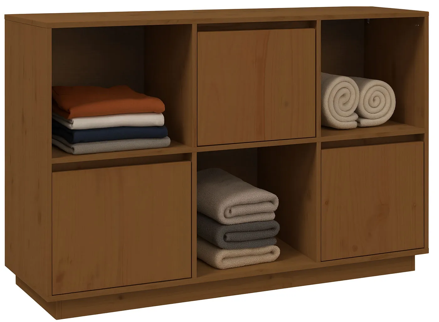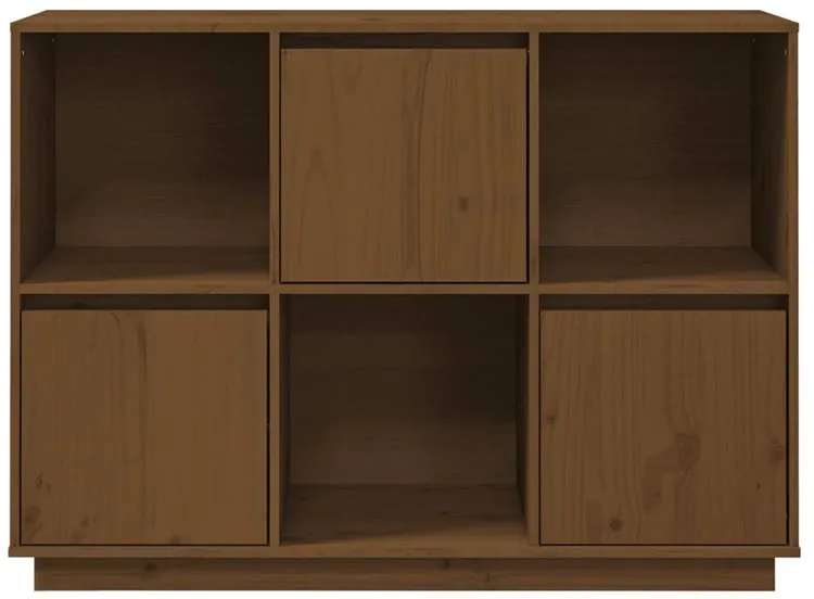 Infografika brązowego sosnowego regału poziomego z 3 szafkami Sorik 3X