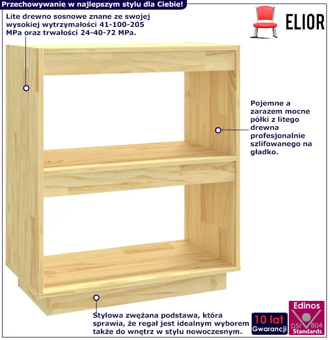 • Ekologiczny wybór: drewno sosnowe jest materiałem odnawialnym, co czyni regał wyborem przyjaznym dla środowiska.