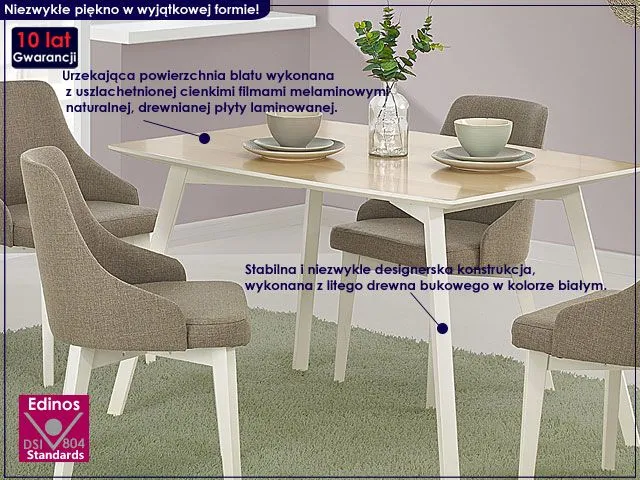 Prezentujemy Ci jakże efektowny wizualnie i bardzo praktyczny w użytkowaniu stół Jureso marki Elior. Wykonana z litego drewna bukowego konstrukcja mebla w kolorze białym została zabezpieczona dwoma warstwami profesjonalnego impregnatu ochronnego o klasyfikacji R10, XN, podkreślającym prawdziwe rysy drzewa i wyjątkowe walory estetyczne. Użyta do produkcji blatu stołu płyta laminowana marki Profeos w kolorze "buk" została uszlachetniona cienkimi filmami melaminowymi. Posiada także specjalne włókna ułożone różnkokierunkowo o strukturze sinusoidalnej, co zapewnia nadanie jej cech jakościowych oraz wytrzymałościowych. Designerski blat wykonany został ze specjalnej płyty komórkowej, której główną zaletą jest redukcja ciężaru bez utraty stabilności oraz innych funkcji konstrukcyjnych.