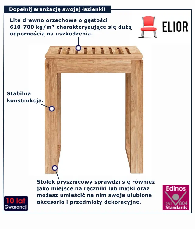 Stołek łazienkowy Sitto marki Elior to inwestycja w codzienny komfort i ponadczasowy design. Jego uniwersalność i solidne wykonanie sprawiają, że będzie Ci służyć przez wiele lat, zawsze prezentując się znakomicie. To nie jest zwykły mebelek, to praktyczny element, który uporządkuje Twoją przestrzeń i doda jej charakteru. Nie czekaj i już dziś wprowadź do swojego domu nutę naturalnego piękna i funkcjonalności w atrakcyjnej cenie 238 zł i ciesz się nim!