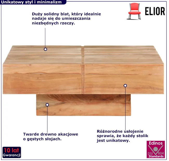 Wyobraź sobie relaksującą chwilę przy filiżance ulubionej kawy, zasiadając przy stole, który emanuje naturalnym pięknem i ciepłem. Stolik kawowy lite drewno akacjowe - Luxin marki Elior to nie tylko element wyposażenia, ale także sposób na stworzenie przytulnej atmosfery w Twoim domu. Wybierz już dziś stolik Luxin w atrakcyjnej cenie 928 zł. Przekonaj się, jak doskonale wpasuje się w Twoje wnętrze!