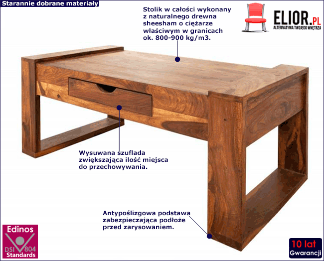 Cenisz sobie meble z "duszą", które produkowane są z zaangażowaniem przez profesjonalistów? Stolik kawowy Dalido wykonany został z najlepszych, naturalnych materiałów przez doświadczonych projektantów polskiej marki Elior. Stolik w całości wykonany został ręcznie z drewna sheesham. Sheesham jest bardzo rzadkim gatunkiem drewna pod względem kolorystyki i wzornictwa. Jest to drewno dla osób szczególnie ceniących estetykę i klasę. Sheesham jest bardzo trudne w obróbce, jednak posiada doskonałe właściwości praktyczne, które wynikają z jego dużej twardości. Drewno to jest odporne na ścieranie. Charakteryzuje się ciężarem właściwym w granicach ok. 800-900 kg/m3, ma bardzo dobrą kurczliwość objętościową wynoszącą ok. 8-10%. Dzięki tym właściwościom drewno to jest wyjątkowo praktyczne, odporne na ścieranie, uszkodzenia mechaniczne. Dodatkowym atutem drewna sheesham jest piękne, unikalne usłojenie oraz nietypowe wybarwienie od jasnych brązów, aż po tonacje fioletowo-brunatne odcienie. Ponadto, cała konstrukcja została pokryta warstwą lakieru, co dodatkowo zwiększa odporność mebla na ścieranie, zarysowania oraz przypadkowe uszkodzenia mechaniczne.