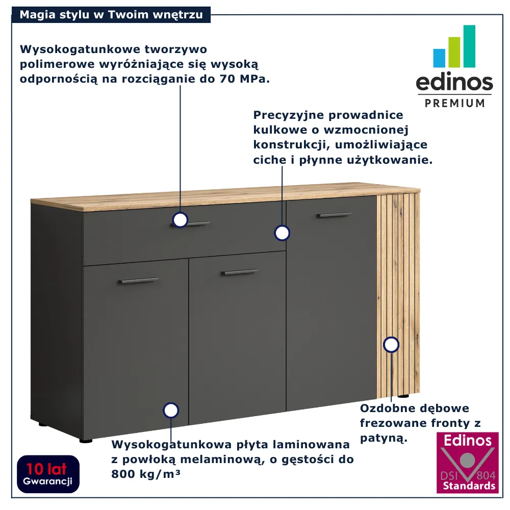 • Produkt posiada certyfikat jakości "Edinos Standards DSI 804", który potwierdza najwyższą jakość wykonania mebla oraz pełny stopień zgodności poszczególnych jednostek wytworzonego wyrobu z przyjętym wzorcem.